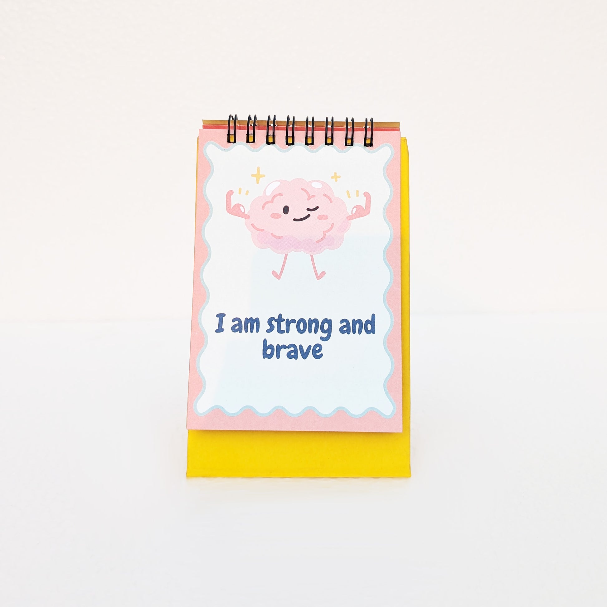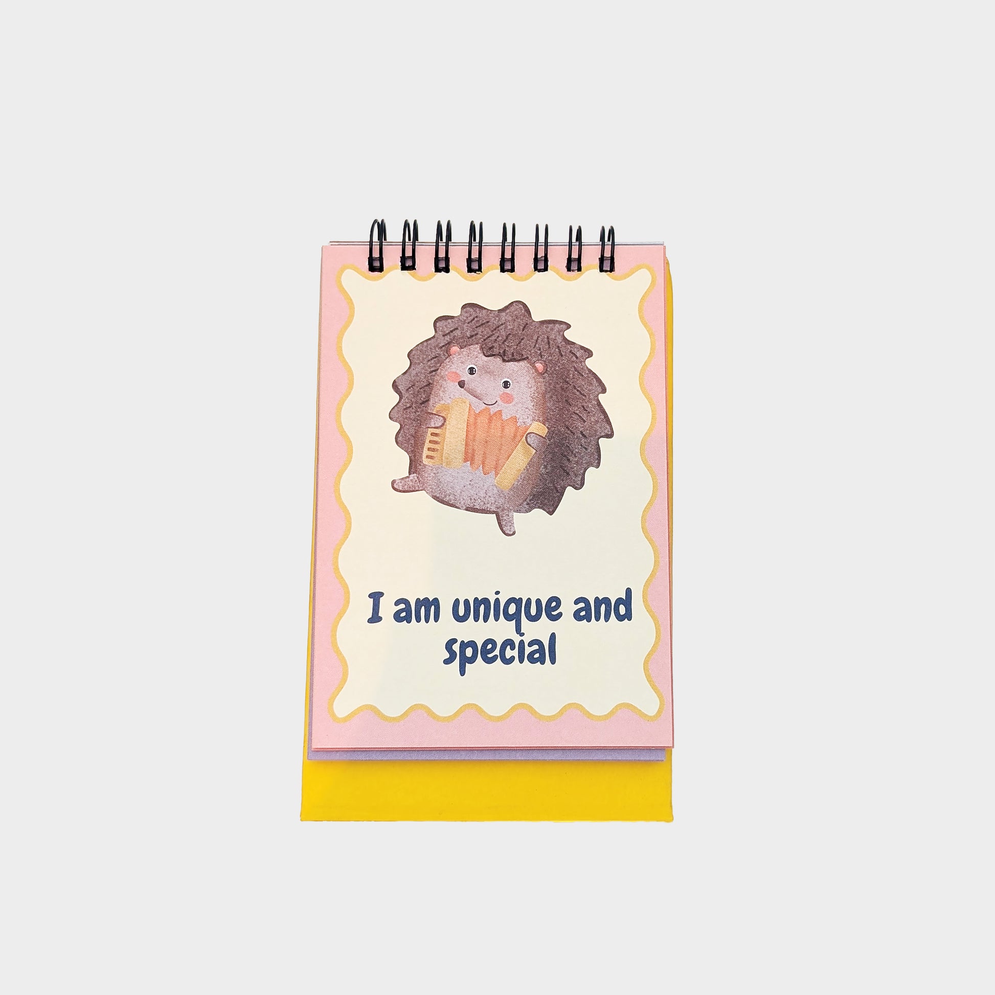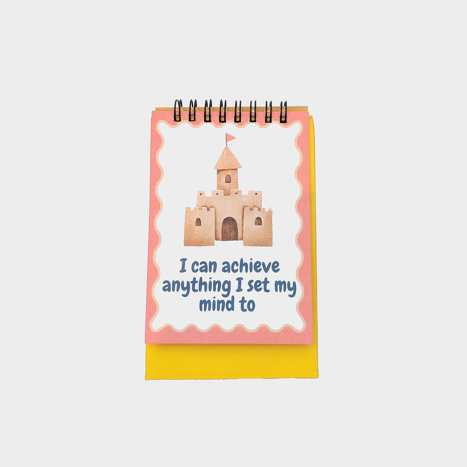 Whimsy’s Affirmation Flip Deck is a compact, spiral-bound flip stand designed to bring daily positivity to your space. Packed in a sturdy cardboard box, it features double-sided affirmation notes with personalised artwork on every page. Made with premium 300 gsm paper, it stands beautifully on any desk, bedside table, or workspace—making it both decorative and motivating.